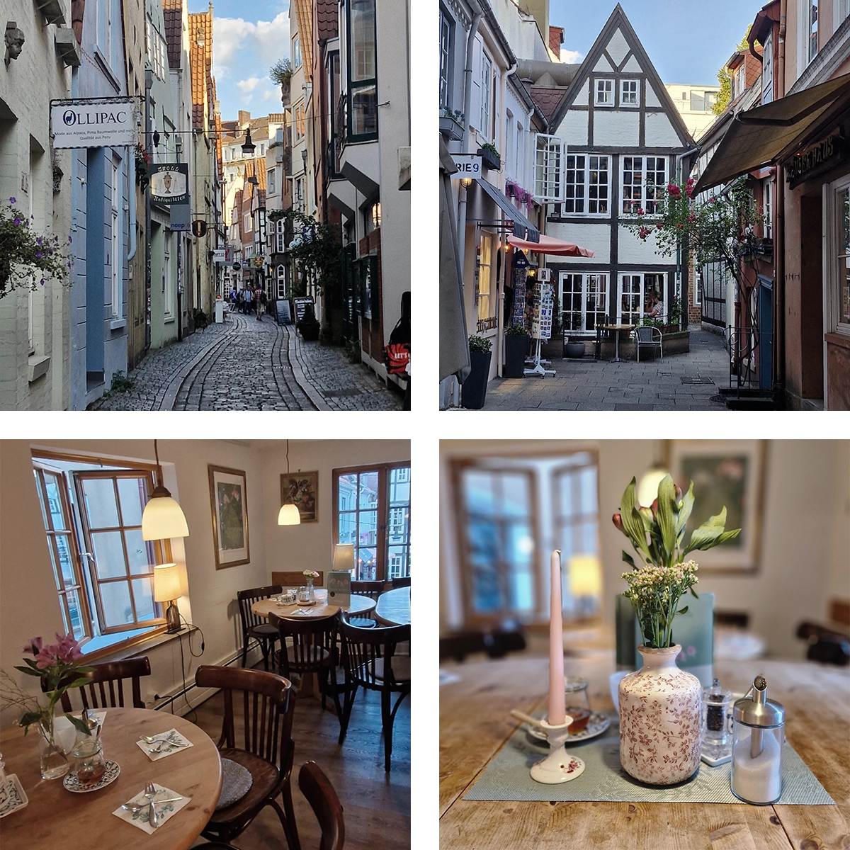im niedlichen Schnoor Viertel, in dem sich die kleinen und sehr schmalen Häuser, wie Perlen an eine Kette (Schnoor) aufreihen. Nach unzähligen Fotos in den verwinkelten Gässchen mit den niedlichen Häuserfassaden, durften wir Gäste im Teestübchen im Schnoor Viertel (https://teestuebchen-schnoor.de/) sein.